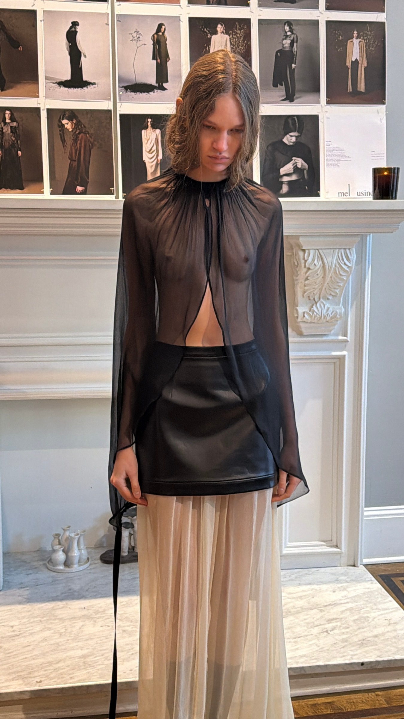 Very into sheer layers like this one at the collection viewing of designer Mel Usine — this one won’t be out til next season, but NY brand Buci has a sheer poncho that’s of a similar vein.